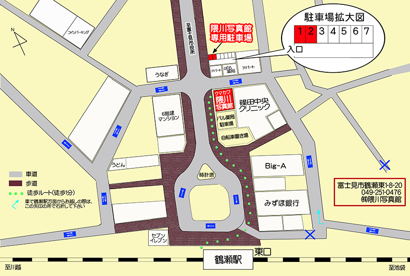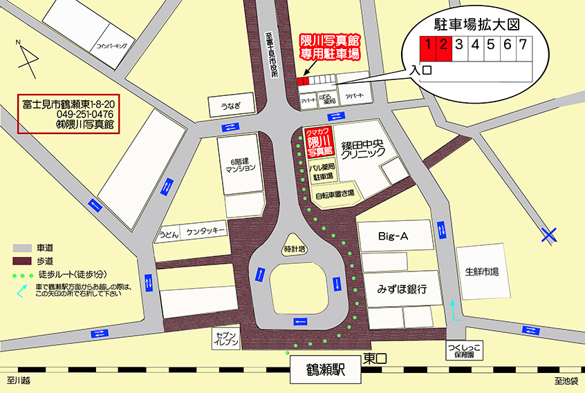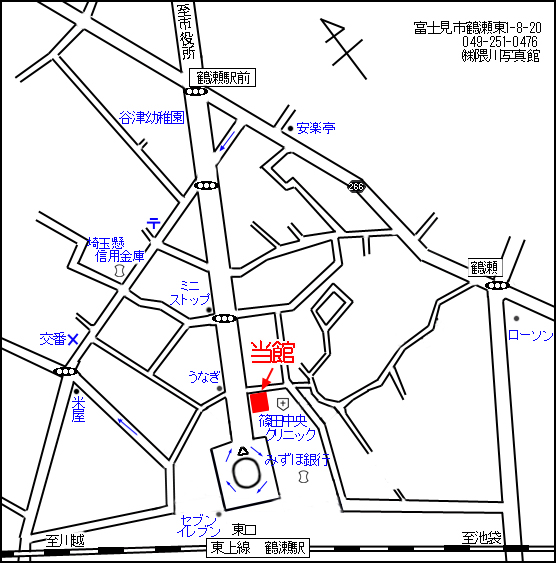 東武東上線鶴瀬駅東口より徒歩1分 東口の階段を降りましたら、右側へ進み、ロータリーに沿って歩いてください。Big-A(スーパー)→自転車置き場→パル薬局駐車場→当館(白い5階建ての5階部分がこげ茶色の建物)です。(^О^)/ |