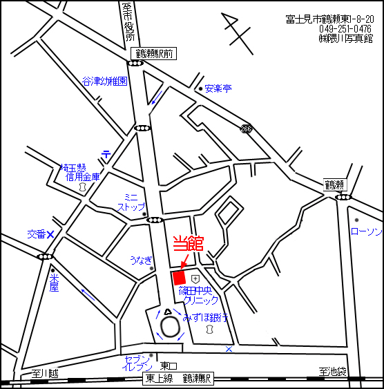 富士見バイパス(旧有料道路)から・・・ キラリふじみのところを降りて下さい。そこから鶴瀬駅方面へ、ひたすら真っすぐです。一回も曲がりません。1.2km程で、左に白い5階建ての建物が見えます。 そちらが当館です。(^О^)/ |