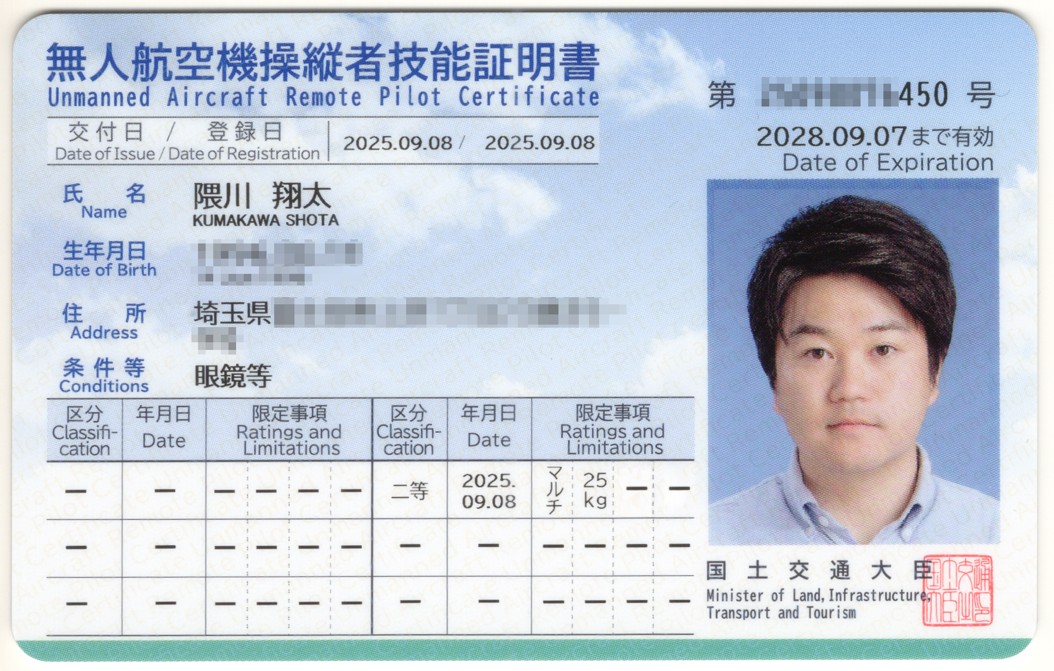 ![]() ![]() ![]() ドローン2等操縦技能士(国家資格)取得。一般社団法人国際無人航空機協議会(IAU)技能認証(ドローン操縦士資格)取得。上空からの撮影に対応いたします。 国土交通省・東京航空局より、弊社社員「隈川翔太」への、人口密集地域(DID)等の飛行禁止空域での飛行許可を取得しております。 これにより、事前申請なしに、日本の大部分の空域でドローンの飛行が可能です。(空港や国の重要施設付近等を除く。また、催し物上空など、別途国の許可が必要な場合もございます) |