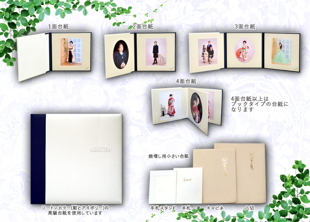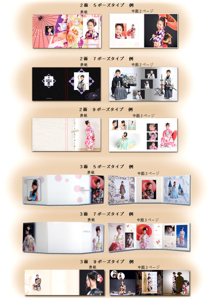 | 当館の記念写真の仕上がりタイプは、3種類ございます。お好みの物をお選びいただきご予約下さいませ。 実物をご覧になりたい方は、店頭に展示してございますので、いつでもご覧いただけます。 1、通常タイプ(ご利用になられる方が、一番多いタイプです。通常の台紙にお写真をお貼りして、お渡しするタイプです) 2、ビジュアル台紙タイプ(台紙がデザインしてあるタイプです) 3、デザインアルバムタイプ(製本してある写真集タイプです) |