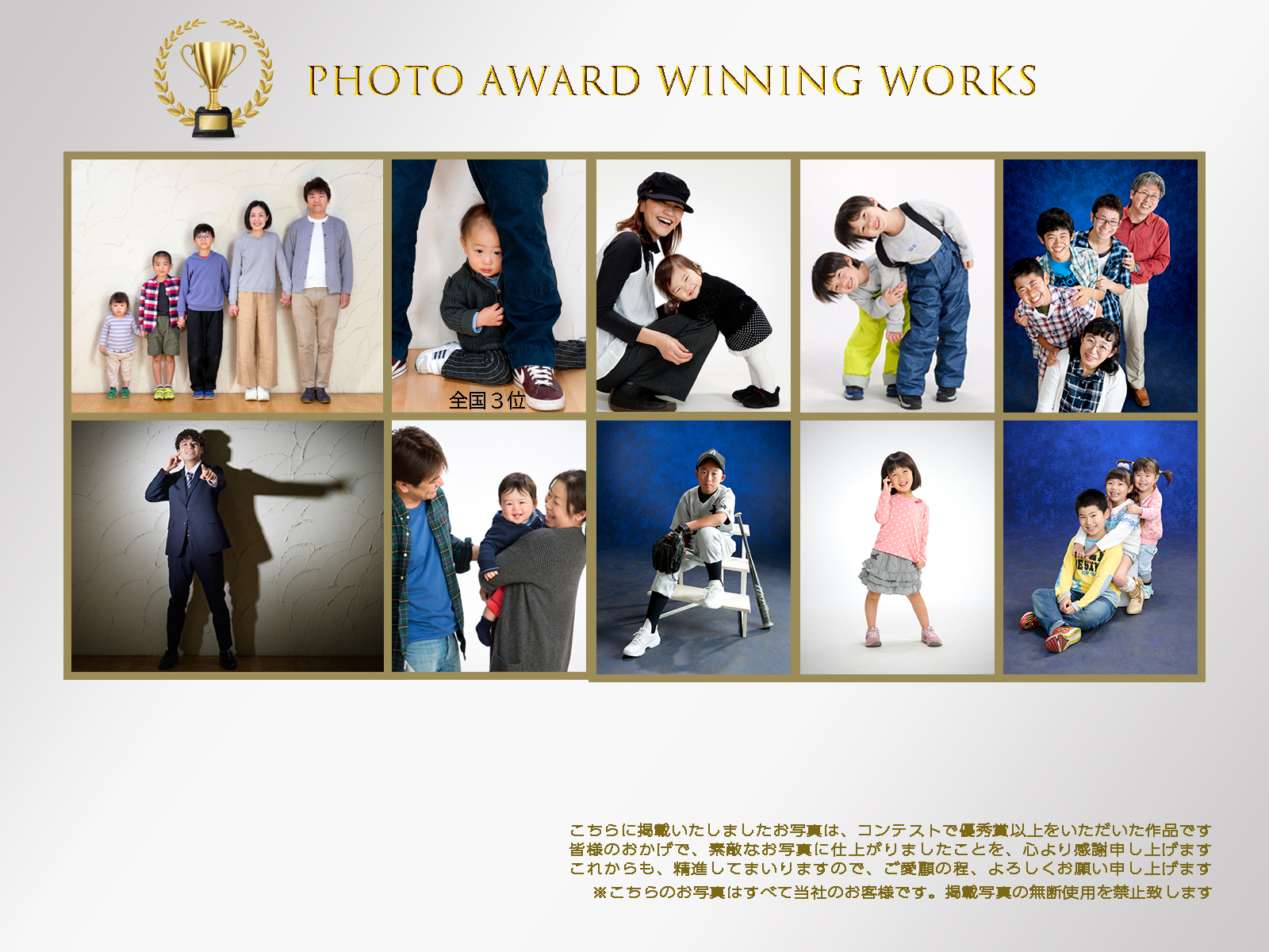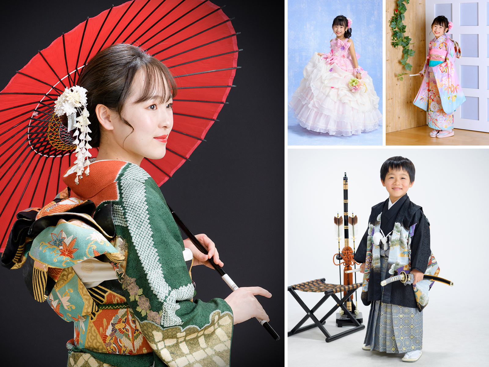 赤ちゃんからおじいちゃんおばあちゃんまで、節目節目の記念写真をお撮りします。そのほかにも、家族写真・お友達同士・受賞記念・生前遺影写真・各種証明写真など、メニューはいろいろ!