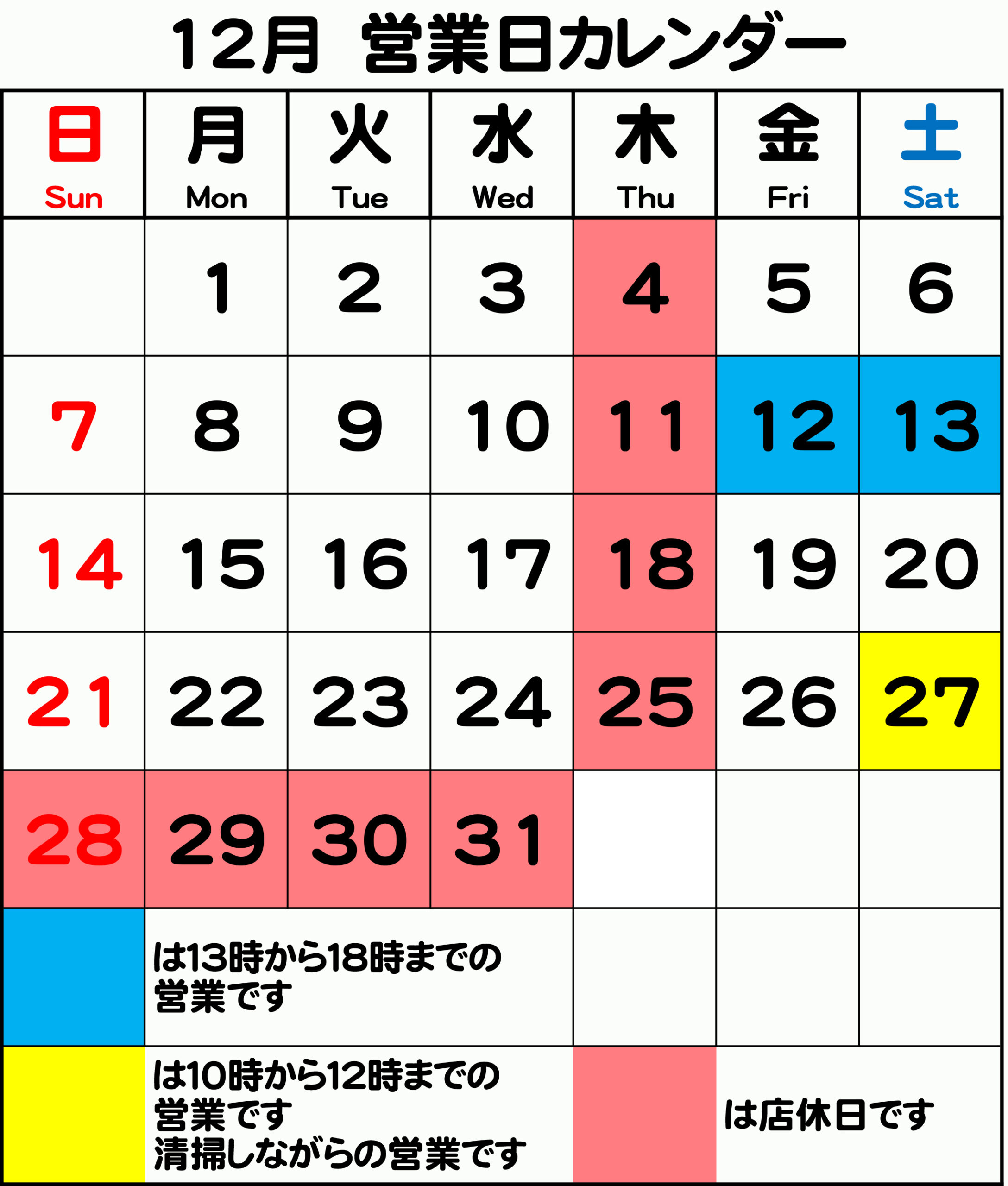 12月の最終営業日は27日で、午前中のみ清掃しながら営業いたします