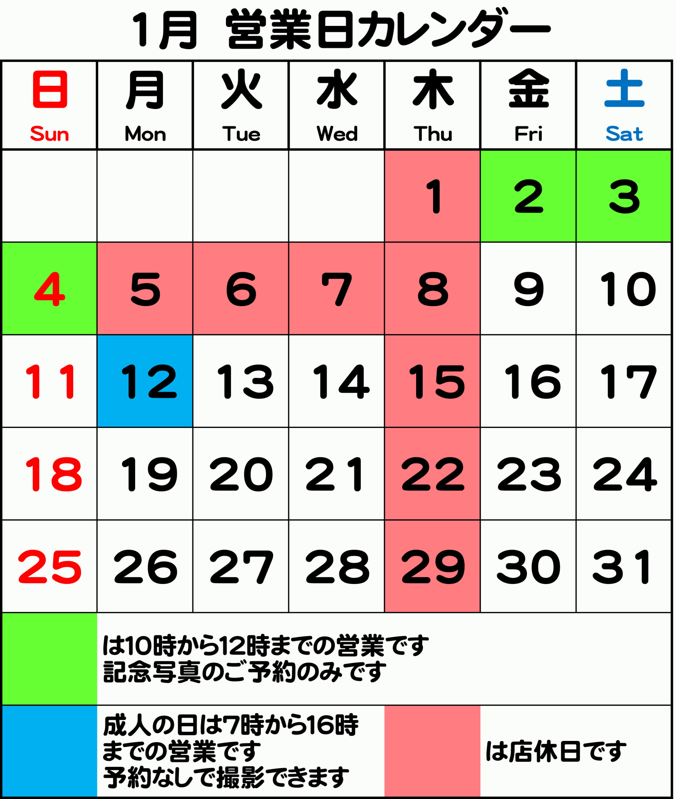 1月は2~4日の午前中、記念写真のご予約のみ承ることができる場合がございます