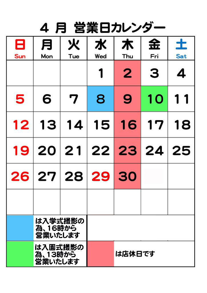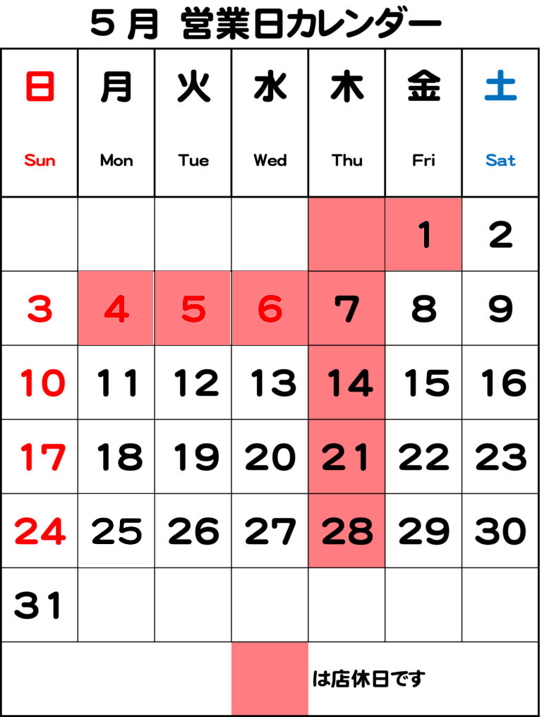お知らせ2026.04.07 4月・5月 営業日のご案内 4月の営業日 3月の営業カレンダーは以下の通りです 5月の営業日 5月の営業カレンダーは以下の通りです お問い合わせは☏049-251-0476または公式LINEアカウントより承ります。公式LINEアカウントはこちら↓ シェアするShare ブログ一覧