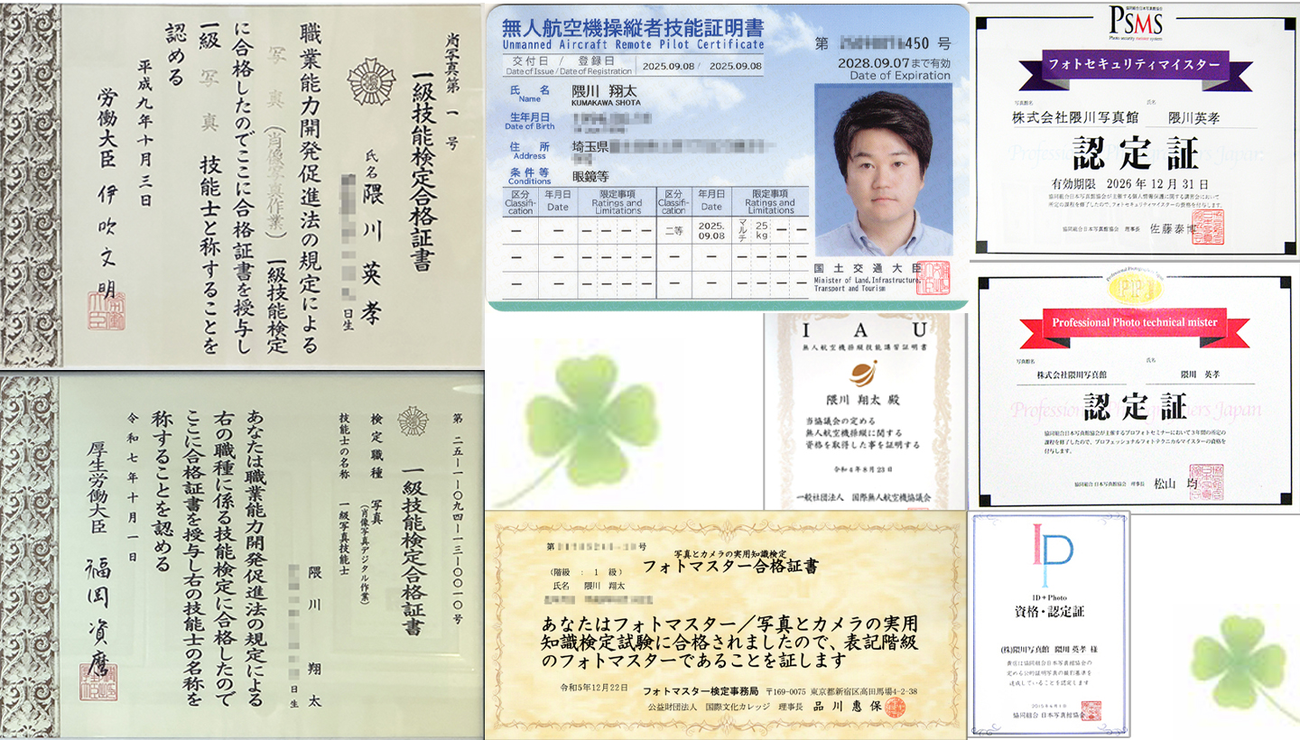 日本写真館協会のセミナーを3回以上受講し、写真技術を深く向上させた者に認定される、プロフェッショナルテクニカルマイスターの資格を取得しております。