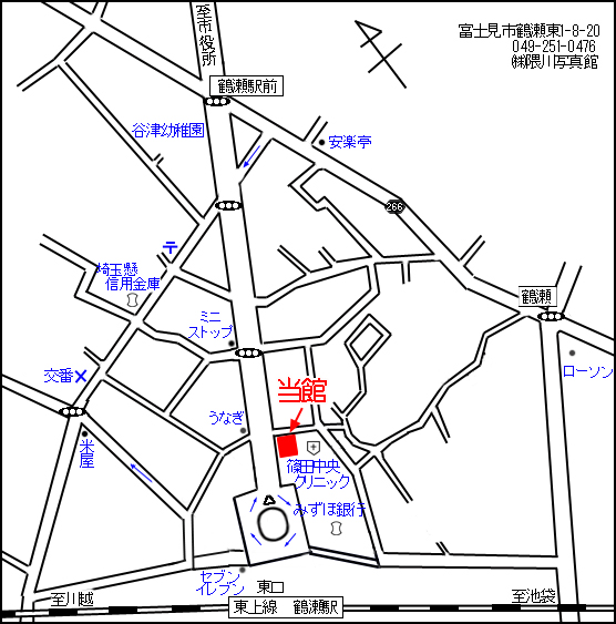 | 富士見バイパス(旧有料道路)から・・・ キラリふじみのところを降りて下さい。そこから鶴瀬駅方面へ、ひたすら真っすぐです。一回も曲がりません。1.2km程で、左に白い5階建ての建物が見えます。 そちらが当館です。(^О^)/ |
